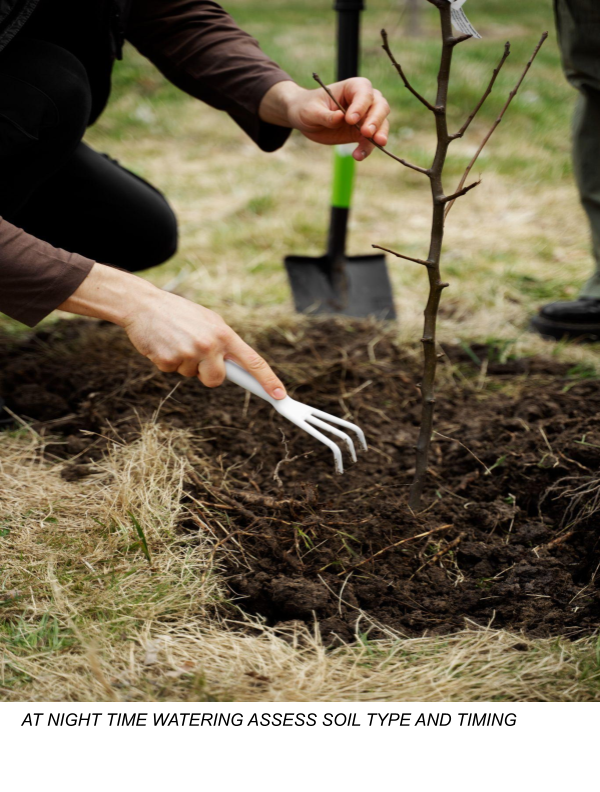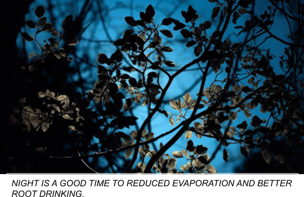 Watering at night keeps the soil cooler and lets water soak deep into the roots, so trees can drink it without getting stressed from the heat.